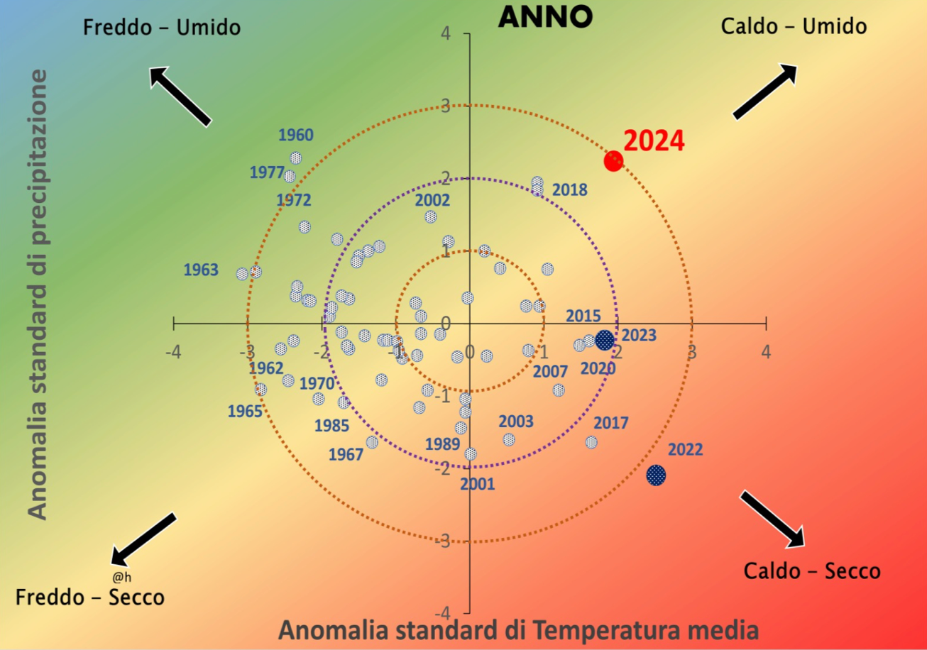 C’è stata molta più pioggia: sono stati contati 1.495,7 millimetri (il 45 per cento in più rispetto alla media degli anni tra il 1991 e il 2020), che collocano il 2024 al secondo posto degli anni più piovosi dal 1958, dopo il 1977. Come si legge nel rapporto, «combinando le anomalie standardizzate di temperature e precipitazioni il 2024 è risultato il più caldo e umido degli ultimi settant’anni» in Piemonte. Le anomalie standardizzate di temperature e precipitazioni indicano quanto questi valori si discostano dalla media del periodo di riferimento (in questo caso il trentennio 1991-2020).