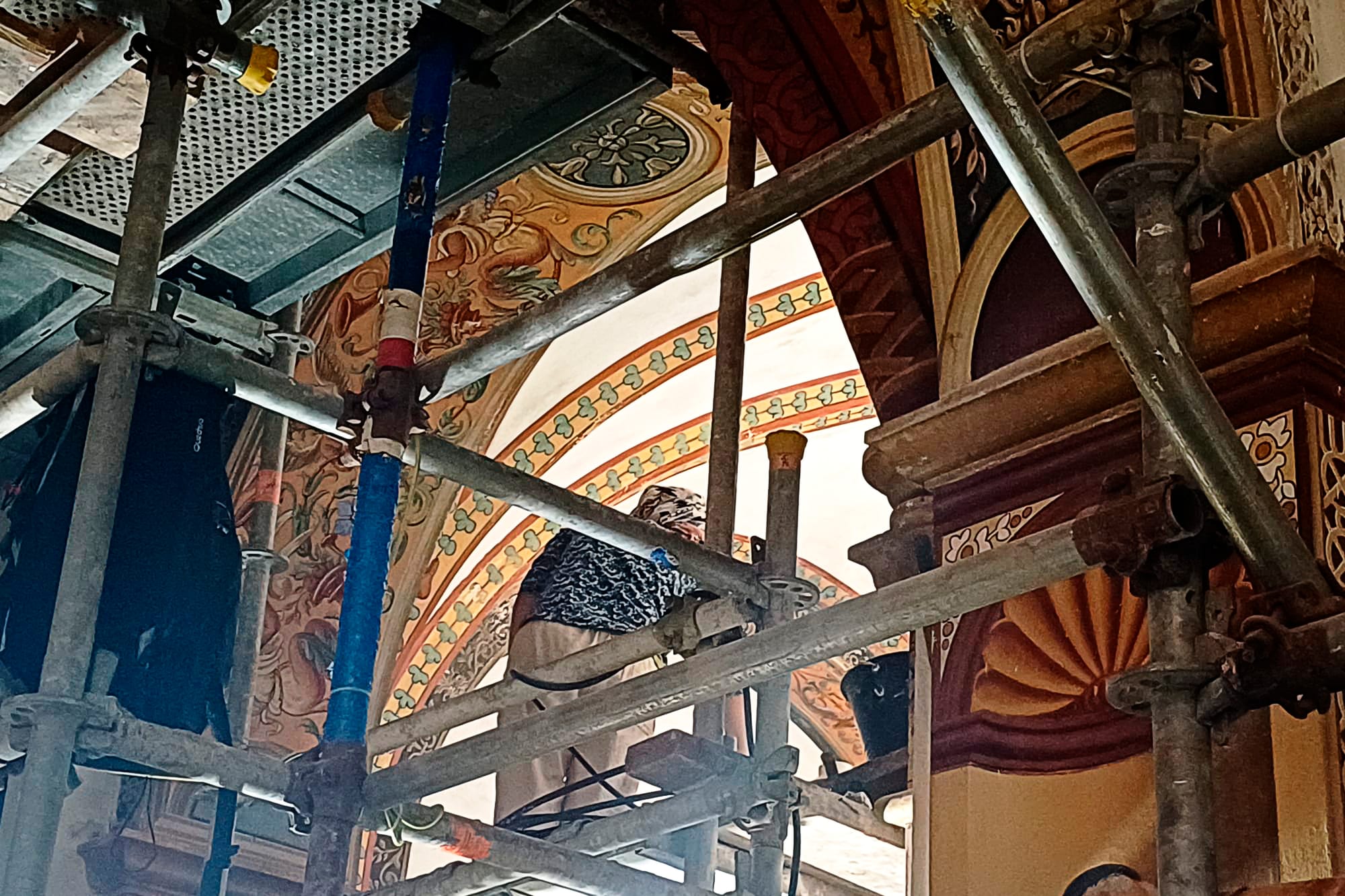 Una grande conchiglia dai colori di nuovo vividi occhieggia tra le maglie della fittissima rete del ponteggio montato per restaurare gli affreschi delle volte. L’immagine è inequivocabile: una parte per il tutto che fa subito capire che la chiesetta dell’Abbazia di San Giuliano non ha la minima intenzione di smentire le sue origini marittime con le fondamenta piantate a due passi dalla spiaggia di lungomare dei Lombardi, con una vista impareggiabile sul golfo, dal Promontorio di Portofino a Capo Mele.