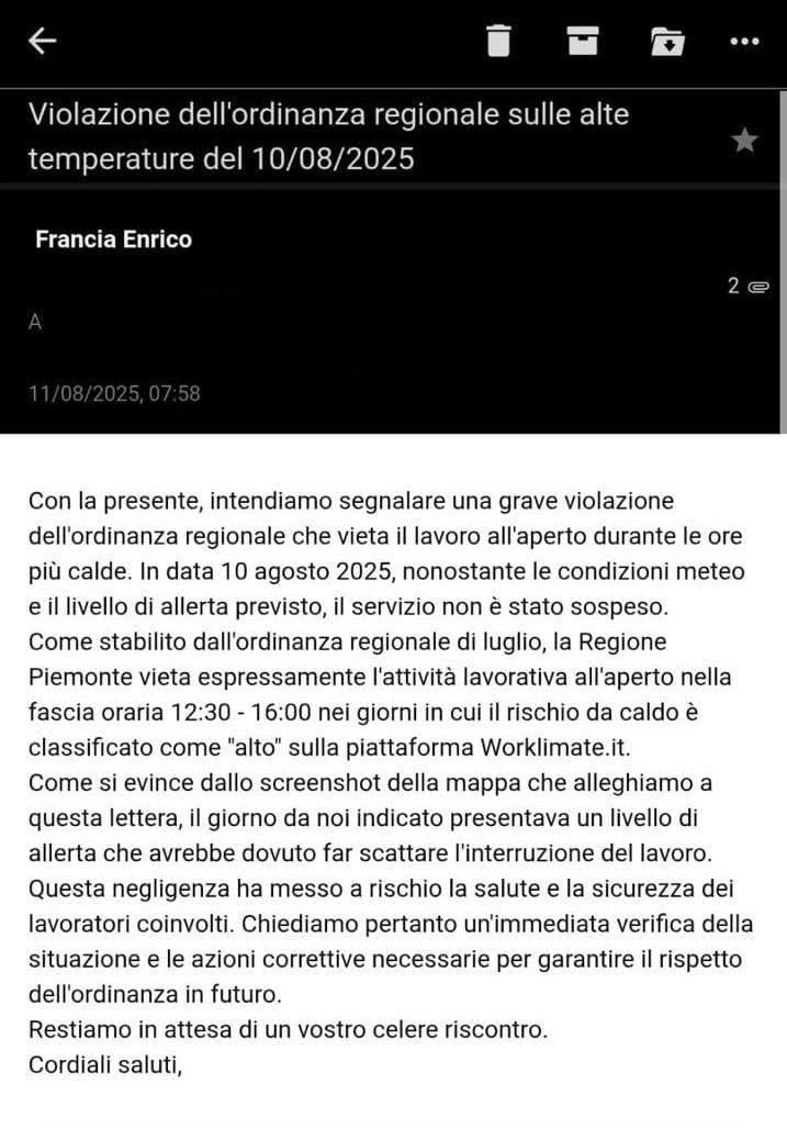 L’ordinanza di Cirio, peraltro, non includeva alcuna forma di ammortizzazione sociale per tutelare il reddito dei lavoratori fermati per il clima: se fa troppo caldo per lavorare, la Regione ti blocca per tutelare la tua salute. Ma alla fine del mese ti ritrovi uno stipendio ridotto.