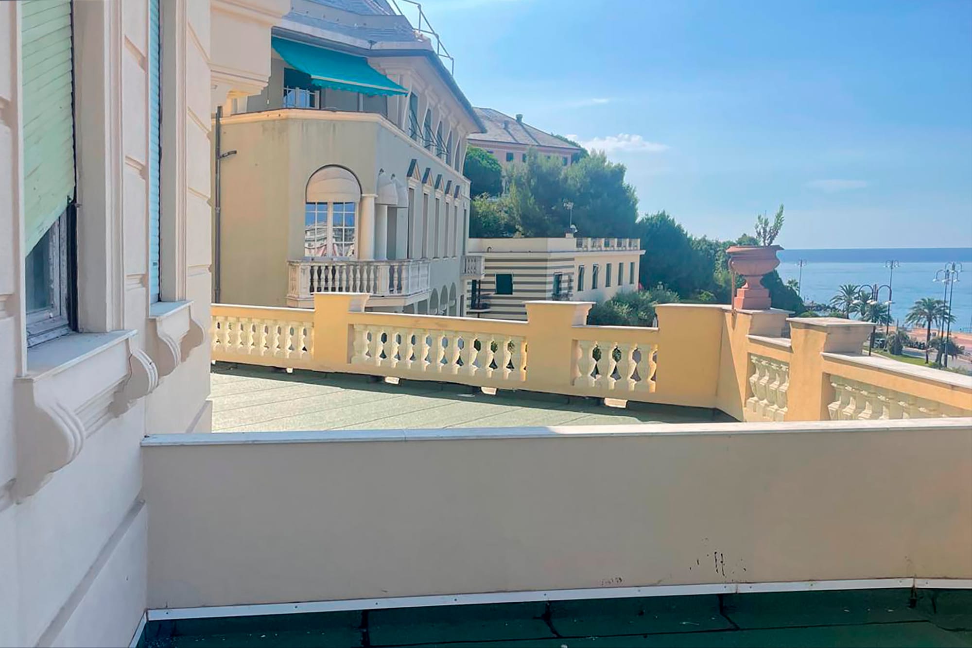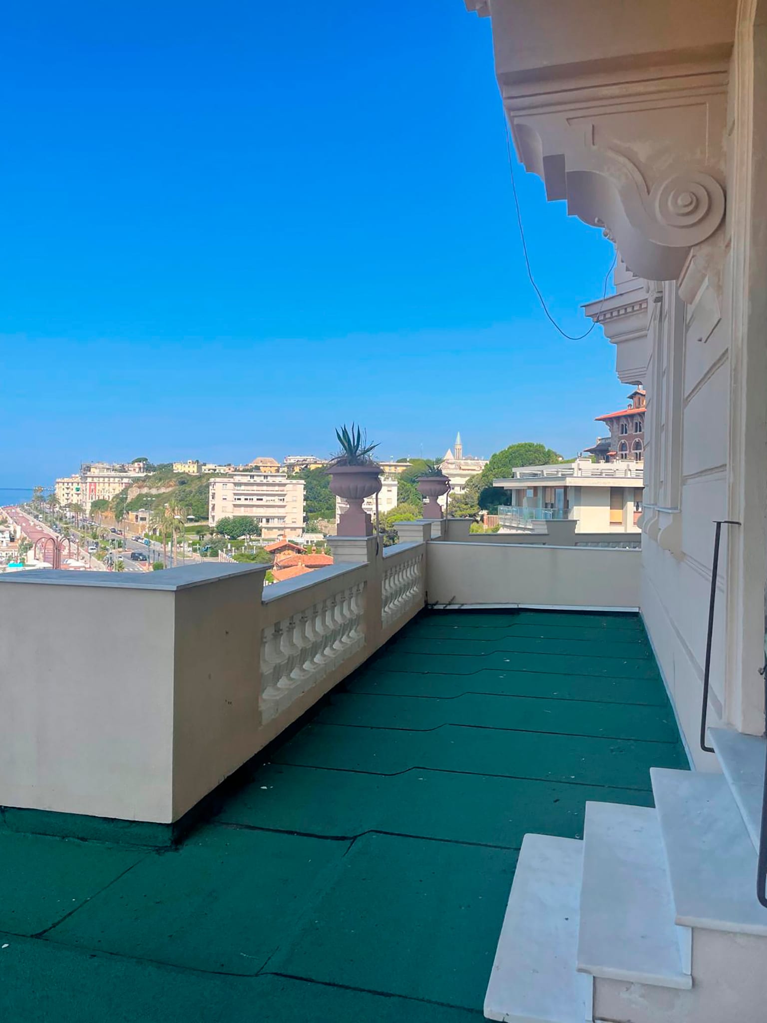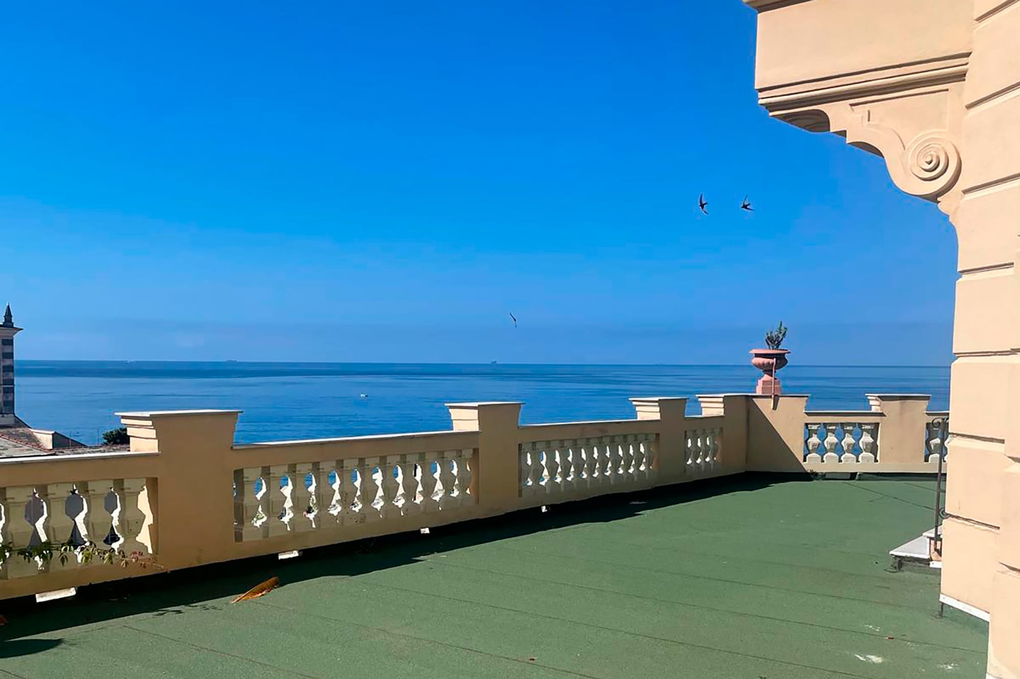 Nelle foto si vedono alcune delle terrazze panoramiche del palazzo che domina dall’alto corso Italia e i particolari di maggior pregio degli appartamenti: i pavimenti in graniglia alla genovese, le geometrie dei parquet, il dettaglio dei campanelli a testa di leone.