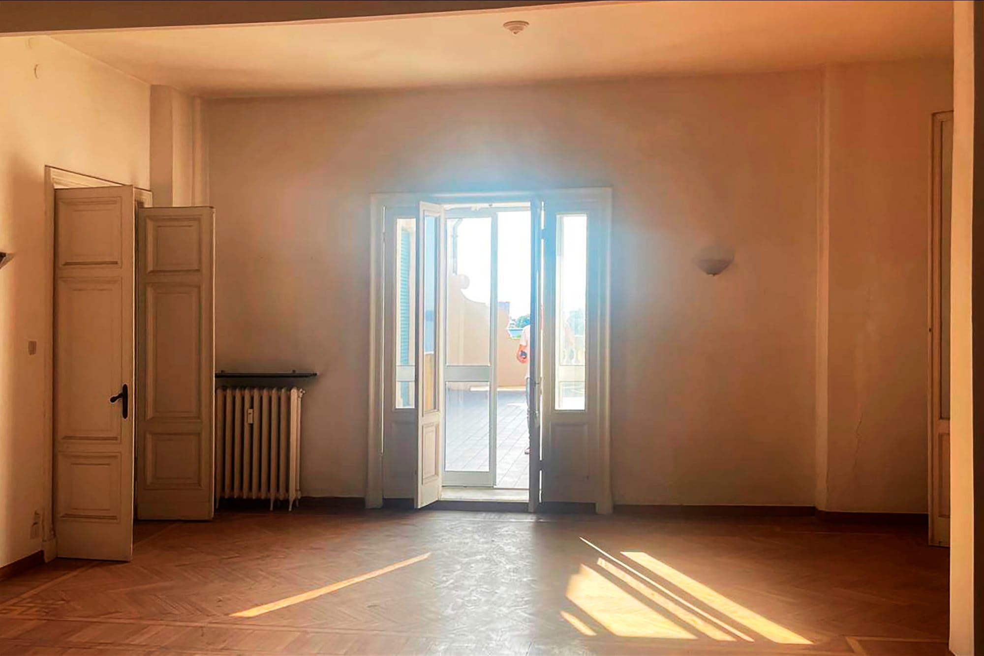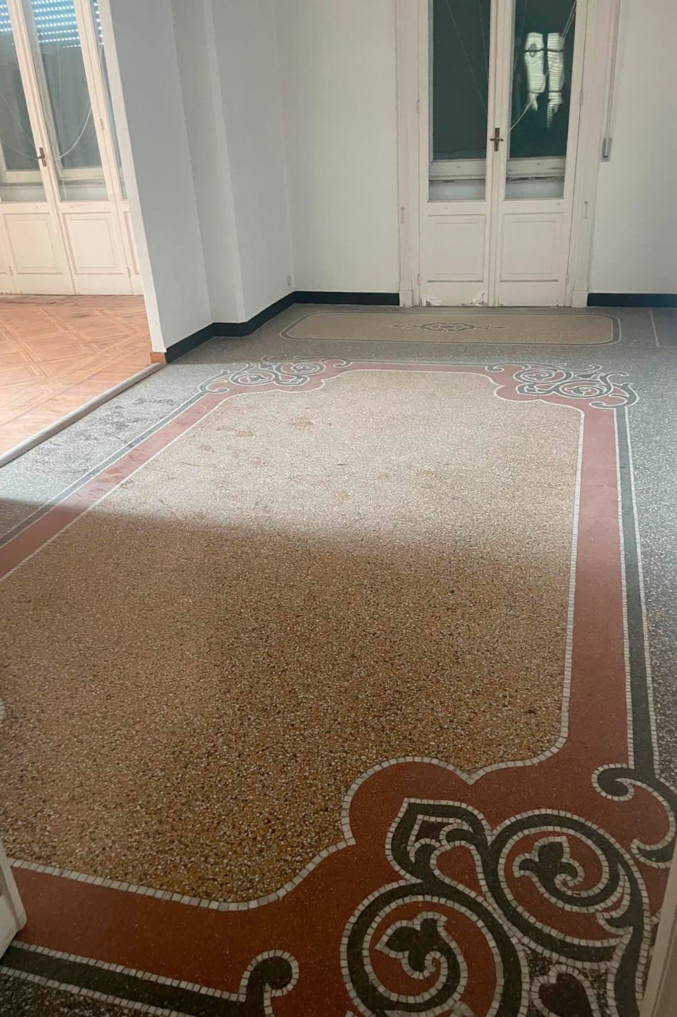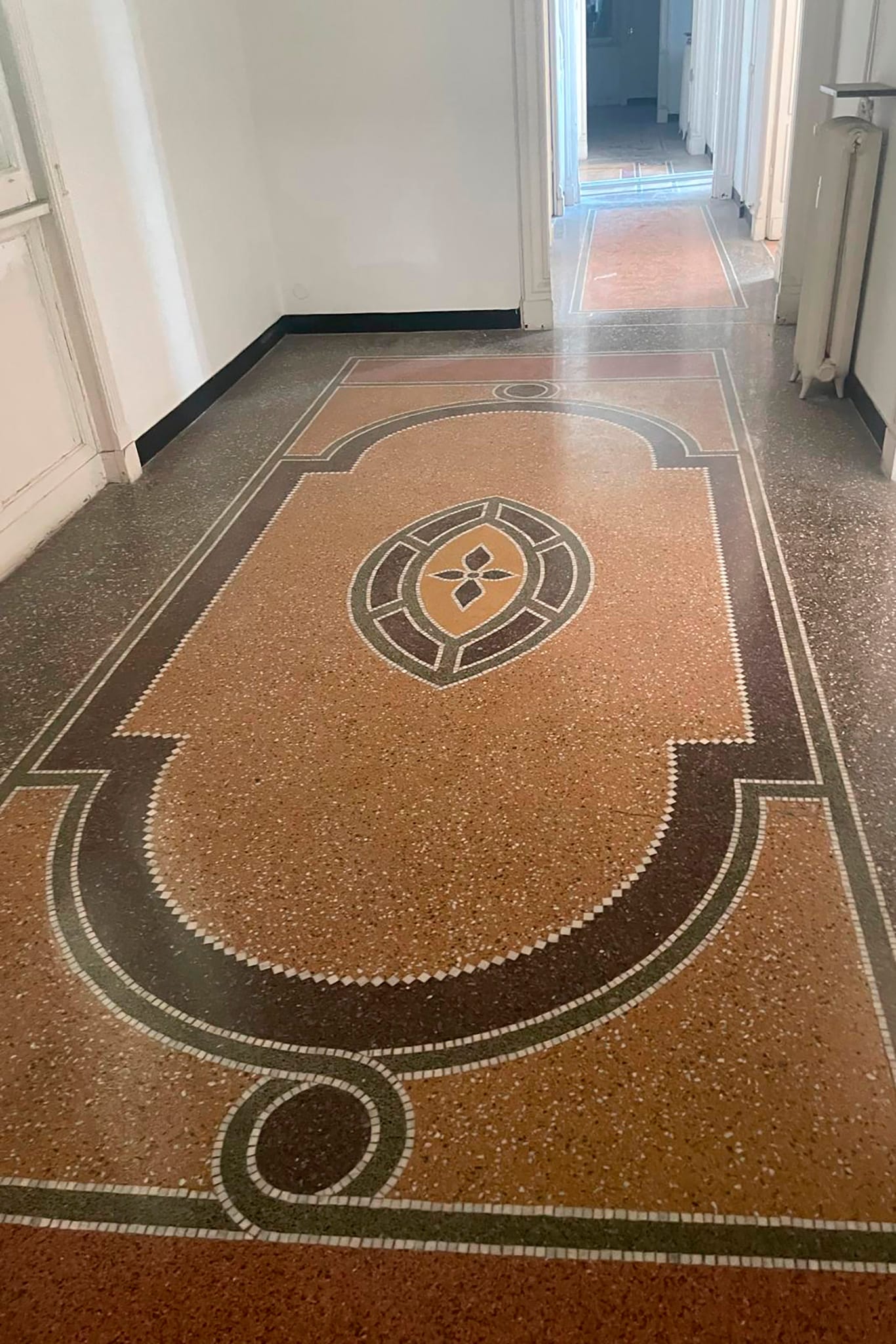 Nelle foto si vedono alcune delle terrazze panoramiche del palazzo che domina dall’alto corso Italia e i particolari di maggior pregio degli appartamenti: i pavimenti in graniglia alla genovese, le geometrie dei parquet, il dettaglio dei campanelli a testa di leone.