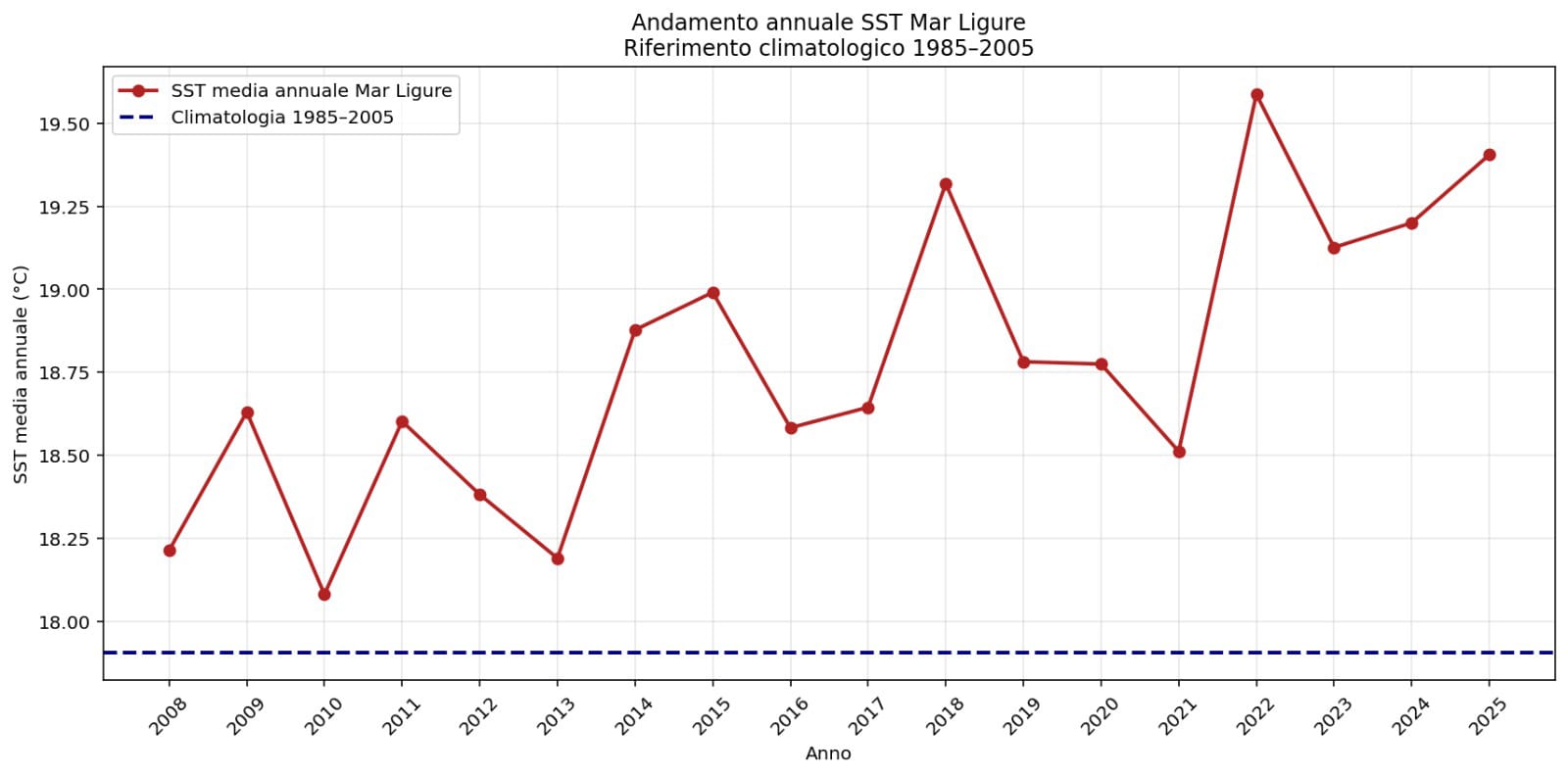 In linea con l’aumento del livello delle acque sono i dati che riguardano le temperature superficiali del mar Ligure. Lo rivelano le misurazioni dell’ARPAL, l’Agenzia regionale per la protezione dell’ambiente ligure, che segnalano proprio nell’estate dello scorso anno un surriscaldamento di sei gradi superiore alla media stagionale tra giugno e luglio e valori sotto costa vicini a 29-30 gradi. Come ha spiegato a L’Unica Antonio Iengo, meteorologo di ARPAL Liguria: «Secondo i dati da noi elaborati, l’andamento della temperatura superficiale del mare (SST) dal 2008 al 2025, confrontata con la climatologia di riferimento 1985-2005, è molto chiaro: il bacino ligure si sta progressivamente riscaldando».