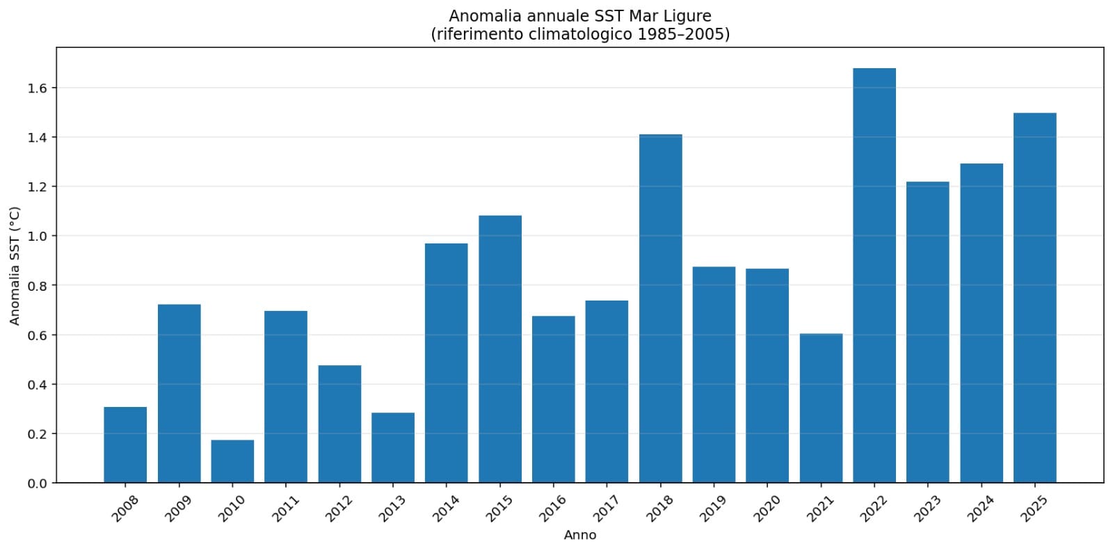 «Il secondo grafico mostra invece le anomalie annuali della temperatura superficiale del mare, cioè lo scarto rispetto alla media 1985-2005. Qui le variazioni risultano ancora più evidenti: dopo il 2014 le anomalie superano spesso 0,8 gradi», ha spiegato ancora Iengo. «Nel 2018 e soprattutto nel 2022 si raggiungono valori eccezionali, superiori a 1,4 gradi e fino a circa 1,7. Un’anomalia annuale di 1,5 gradi su scala di bacino non è un semplice episodio stagionale, ma un chiaro segnale di riscaldamento strutturale». E si deve poi tener contro che si tratta delle misurazioni eseguite dalla boa ARPAL di Capo Mele, che si trova a tre chilometri al largo di Andora. Pertanto, i valori registrati sotto costa, magari sulla battigia, possono essere superiori anche di diversi gradi.