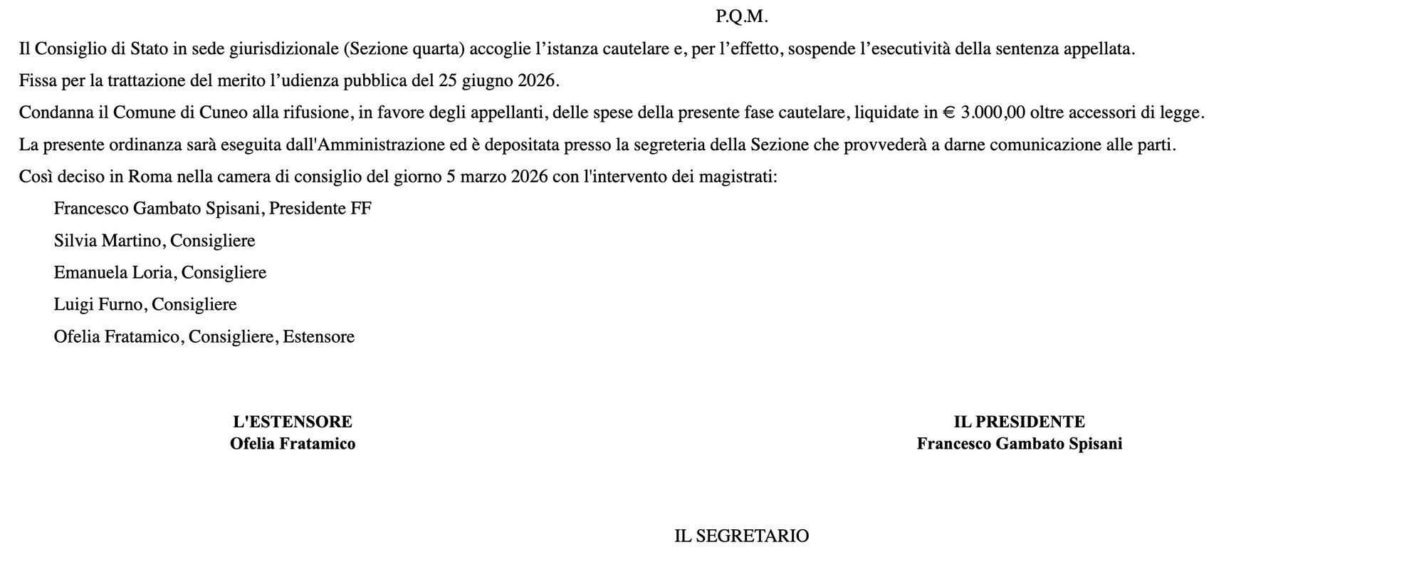 Accanto alla mobilitazione pubblica si è aperto il fronte giudiziario. Dopo un primo passaggio al Tribunale di Cuneo e al Tribunale amministrativo regionale (TAR) del Piemonte, il ricorso è arrivato al Consiglio di Stato. Nell’ottobre 2025 i giudici hanno concesso una sospensiva cautelare, ritenendo non adeguatamente motivata la scelta di abbattere i cedri. «In quello che ha scritto il Consiglio di Stato concedendoci la sospensiva c’è esattamente la giustificazione del perché noi vogliamo i cedri: non sono solo un elemento ecologico in una piazza altamente trafficata, la gente è legata a queste piante perché qualcuno ci è nato, qualcuno ci è cresciuto, qualcuno ha imparato ad andare in bicicletta, qualcuno giocava con l’acqua della fontana da piccolo», ha detto la referente di “Di piazza in piazza”, sostenendo che oltre al valore ambientale dei cedri ci sia anche quello culturale. «Secondo noi riqualificare non significa azzerare un luogo della città, significa migliorarlo. Con l’intervento previsto dall’amministrazione questa piazza diventerebbe irriconoscibile e noi non vogliamo che questo avvenga».