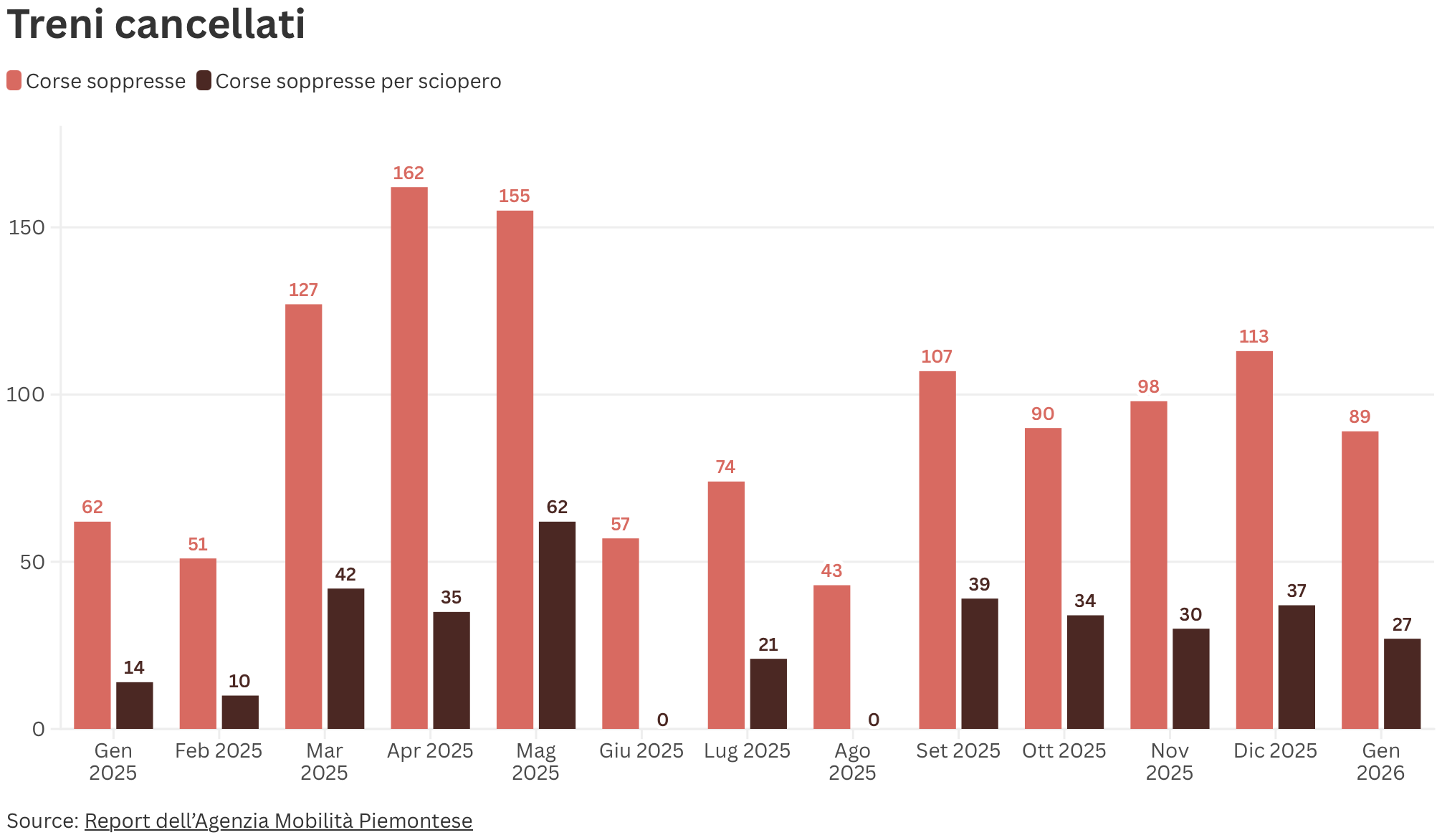 I dati mese per mese restituiscono l’andamento di un anno difficile. Con 162 corse soppresse, aprile 2025 è stato il mese con il più alto numero di cancellazioni, mentre agosto 2025, con 43, è stato quello con il numero più basso. Nel complesso, nel 2025 le cancellazioni dovute agli scioperi sono state 324. Restano quindi 815 soppressioni che non dipendono da agitazioni sindacali. Ed è proprio su questo punto che si concentra l’interrogazione presentata da Avetta.