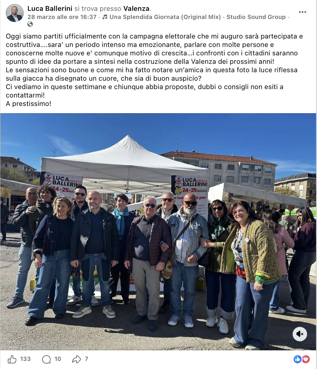 «Siamo partiti ufficialmente con la campagna elettorale che mi auguro sarà partecipata e costruttiva», ha scritto Ballerini sui social. «Sarà un periodo intenso ma emozionante, parlare con molte persone e conoscerne molte nuove, è comunque motivo di crescita. I confronti con i cittadini saranno spunto di idee da portare a sintesi nella costruzione della Valenza dei prossimi anni».